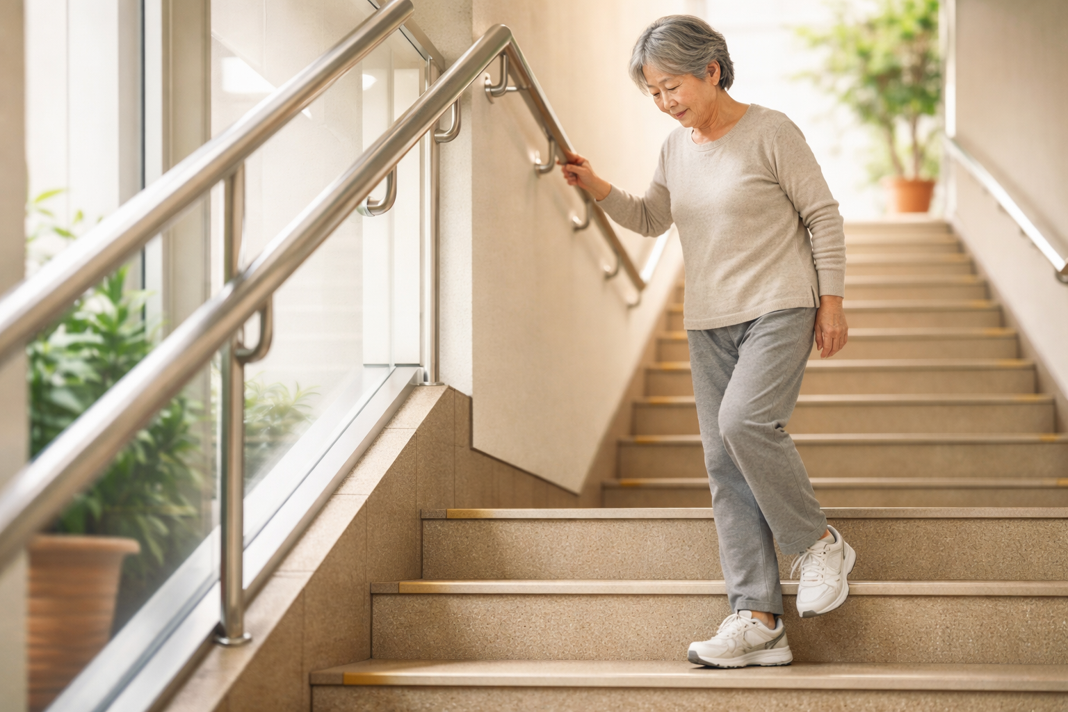 - 手すりは“体を引き上げる”ではなく“体を寄せる”:強く引くと肩が上がり前荷重に。軽く体を寄せ、足元の安定を優先。