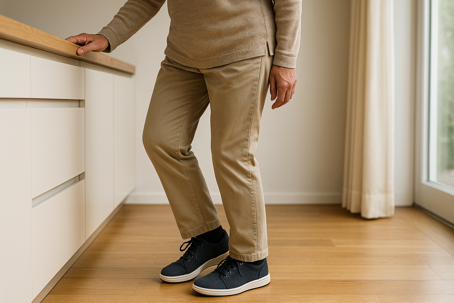 - 足もと:かかとが浅い・甲が緩い靴=前滑り→一歩目で股関節前側に負担 → かかと深め+甲ロックに